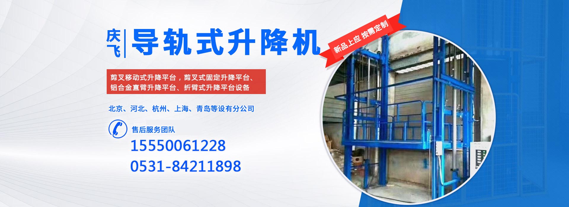 济南庆飞机械设备有限公司目前专心致力于液压升降平台领域。公司主要产品有:剪叉移动式升降平台,剪叉式固定升降平台、铝合金直臂升降平台、折臂式升降平台、曲臂式升降平台、车载式升降平台、牵引式升降平台、自动行走式升降平台、移动式固定式登车桥、桅柱式铝合金升降平台、铝合金升降舞台、固定轨道台面旋转式升降平台等,产品广泛适用于电力、通讯、路灯、交通、交警、建筑装簧、园林、广告、高速公路、大型厂矿企业等领域,还可根据用户的需求设计制造包括特殊尺寸、承载能力、防爆电器的液压升降台。